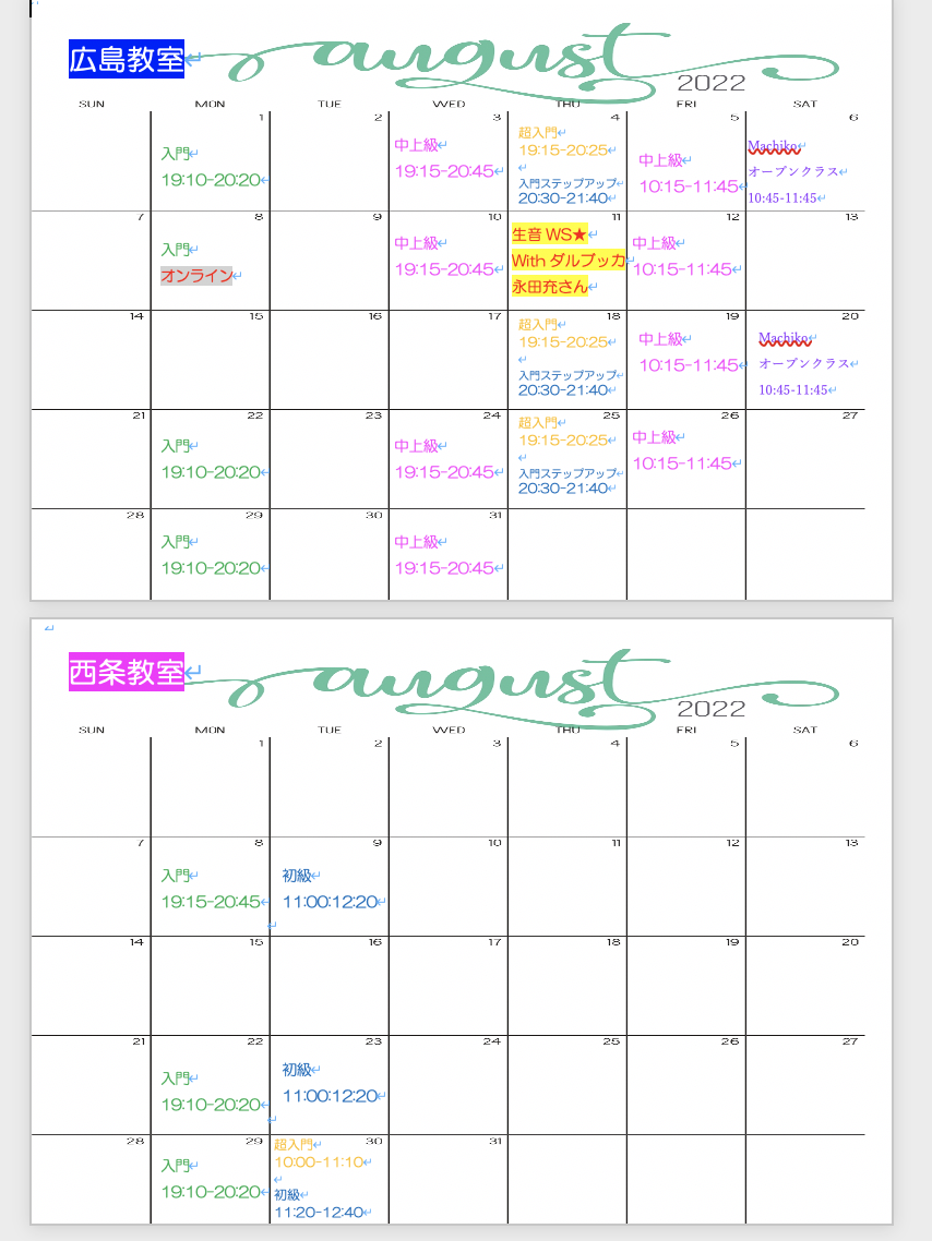 8月広島|西条教室レッスンスケジュールUPしました♪ (2022-07-21)